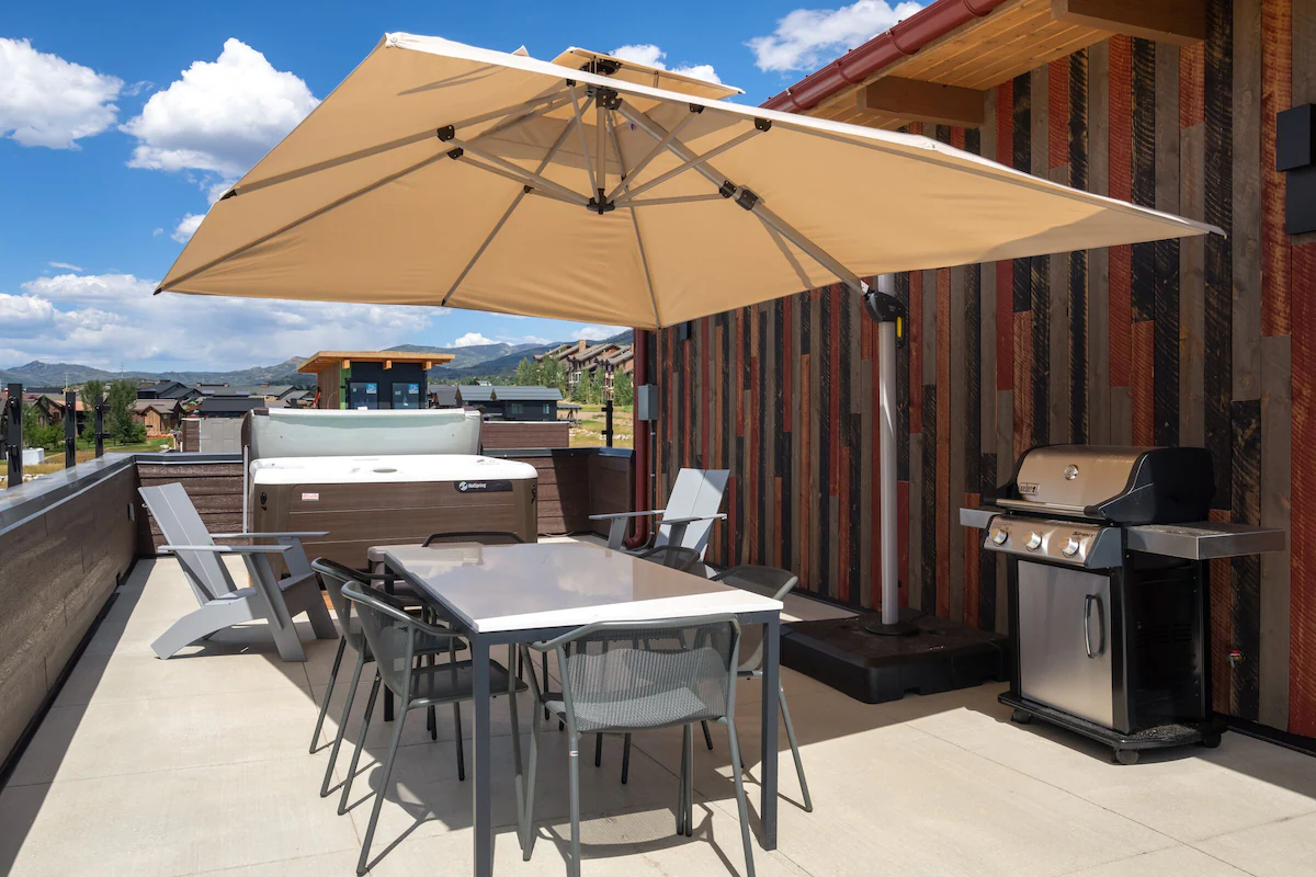 The rooftop retreat is heated and drained, ensuring it remains clear and accessible even in winter months. This outdoor sanctuary is perfect for sunbathing, cooking out with friends, or soaking in the hot tub while taking in breathtaking views of the surrounding mountains. The firepit provides a cozy spot to gather and enjoy evenings under the stars.